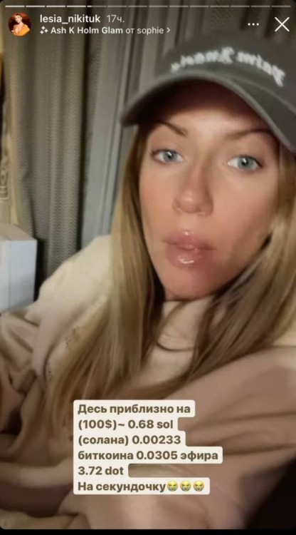 Перед камерою жінка постала в худі бежевого кольору. Свій образ Леся Нікітюк доповнила стильним головним убором. Також телеведуча пожартувала, що могла б витратити ці кошти на криптовалюту.