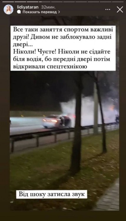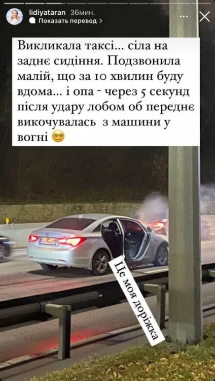 Також Лідія Таран додала, що їй дуже пощастило. За словами телеведучої, якби задні двері заблокувались, то жінка не вижила б. Зірка повідомила, що аварія сталася через інших учасників ДТП, які не поставили на дорозі трикутник – попереджувальний знак.