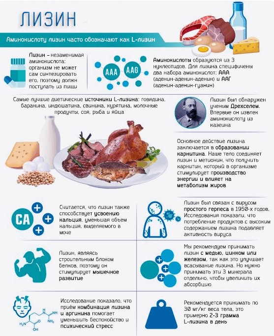 З 1950 року дієтологи активно ведуть дослідження, які доводять зв’язок між рівнем амінокислот і активністю вірусу герпесу. Вони з’ясували, що вживання аргініну стимулює зростання вірусних клітин, стає причиною рецидиву і важкого загострення. З іншого боку достатня кількість лізину зміцнює імунітет, пригнічуючи інфекцію.