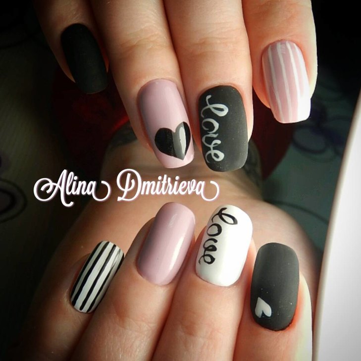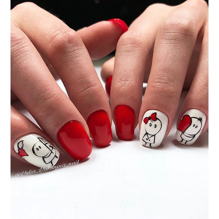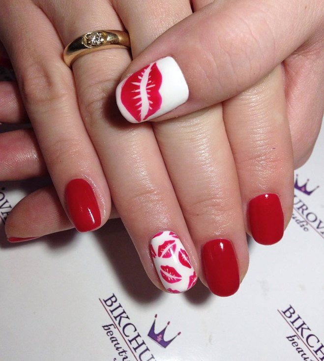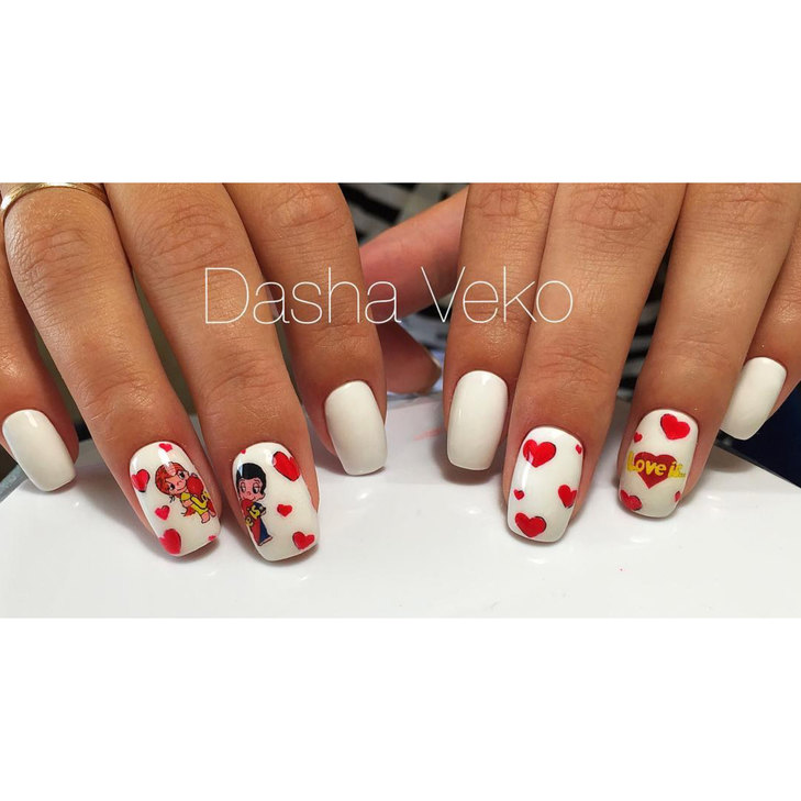 Ті, хто полюбляють яскраві дизайни можуть спробувати зобразити на нігтях сценки з «Love is …» або просто написати «I Love You» контрастним лаком.