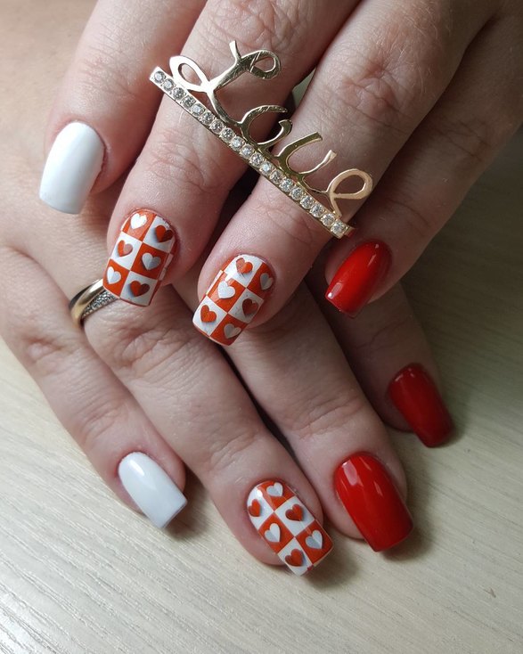 Напередодні свята одним з найпопулярніших замовлень у nail-майстрів є поєднання червоного лаку з білими сердечками. Не дивно, адже класичний червоний – головний колір Дня святого Валентина, а серце – головний символ любові!