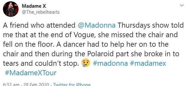 Одна з прихильниць співачки написала в Twitter: “Моя подруга, яка відвідала шоу Мадонни в четвер, розповіла мені, що в кінці виконання Vogue вона впустила стілець і впала на підлогу. Танцюрист допоміг їй піднятися, а потім вона розплакалася”.