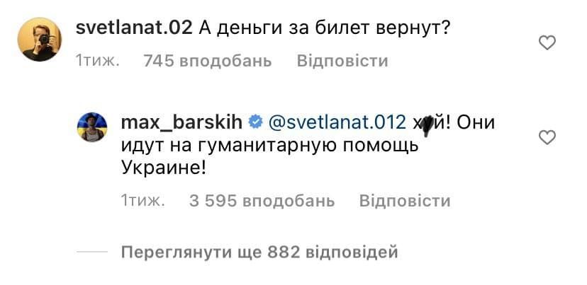 А ще Макс Барських заявив, що не планує повертати росіянам гроші за скасовані концерти. Чоловік повідомив, що всі кошти віддасть на гуманітарну допомогу українцям. Про це артист заявив у відповіді на коментар підписниці під одним з його дописів.
