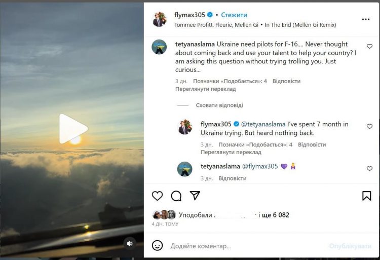Чоловік із задоволенням відповів на це запитання. Він заявив, що неодноразово хотів сісти за штурвал винищувача, однак, протягом семи місяців йому так і не дозволили цього зробити. “Я провів сім місяців в Україні, намагаючись. Але нічого так і не почув у відповідь”, – прокоментував Максим Михайлюк.