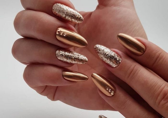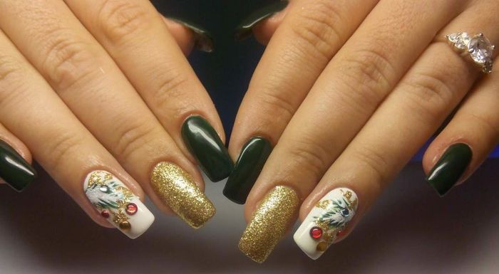Золотий колір – даний колір символізує благородність, багатство і розкіш, чому б не прикрасити ним новорічний манікюр? Не обов’язково фарбувати таким кольором всі нігтики, можна зробити лише кілька, а інші прикрасити за допомогою елементів даного кольору.