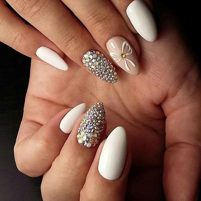 Незважаючи на новоспечені тенденції короткої довжини нігтиків, все ж залишилися шанувальниці довгї нігтьової пластини, на якій виконуються мигдалевидна або овальна форма манікюру. Кращим помічником для таких нігтів стануть стрази різної форми і розміру.