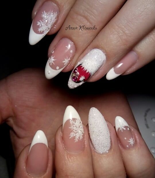 Неймовірною популярністю для даної довжини користується френч з виконанням посмішки у вигляді блискіток або глітеру. Обов’язковим доповненням новорічного манікюру стане фок, стрази, декоративний пісок, мармелад і камені.