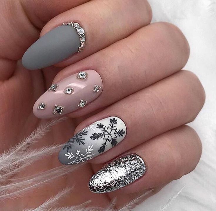 Не варто заповнювати малюнками всі нігтики, це перевантажить дизайн. Ідеальним варіантом стануть сніжинки на кожному нігтику.