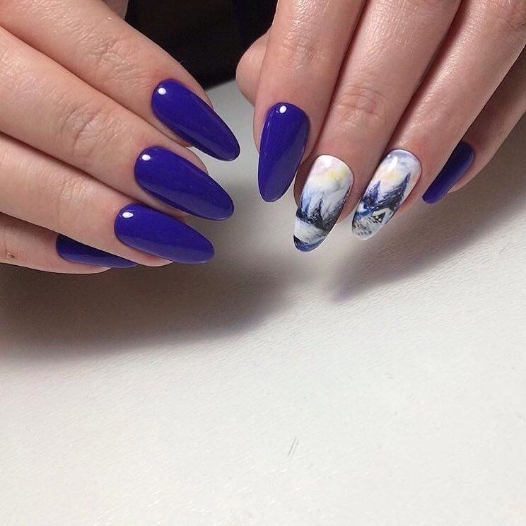 Сині тони – в зимовий період стильно вибирати більш холодні тони лаку. Новорічний манікюр цьому не виняток. Як доповнення використовуйте малюнки або візерунки білого тону.