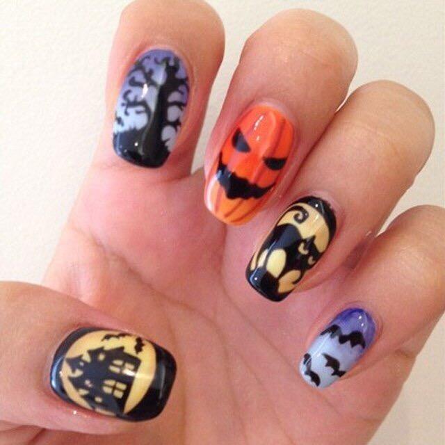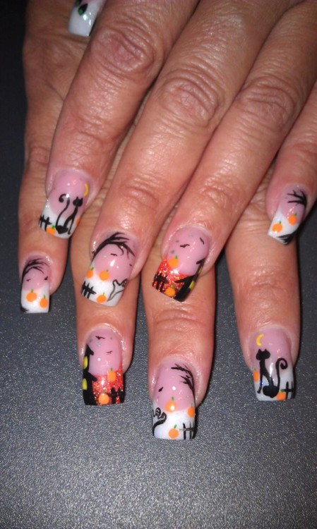 Відьомський манікюр ви можете зробити або за допомогою наклейок, або за допомогою власних навичок в малюванні. Подивіться, як вирішив це питання стиліст. Він створив спочатку френч, використавши дуже блідий лак під основу і чорно-помаранчеву гамму для самого нанесення смужок. Потім на кожен ніготь були нанесені зображення смерті з косою, відьми, павуків і чорних кішок. Для Хеллоувіну – ідеальний манікюр!