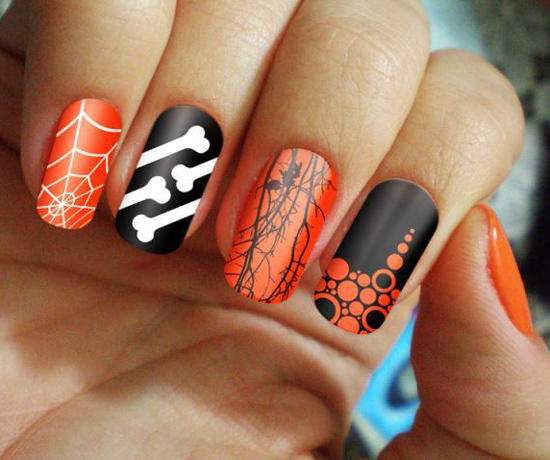 Якщо ви молоді і незалежні, але вам, без сумніву, подобаються незвичайний тематичний манікюр. Наприклад, на подовжені нігті овальної форми можна зробити ось такий нейл-арт, присвячений Хеллоувіну. Найкраще для цього підійдуть чорний, червоний і білий лаки. Малюнок може бути будь-яким, головне, щоб він відповідав тематиці. Павутина, голі гілки дерев, кістки – і малюнок готовий!