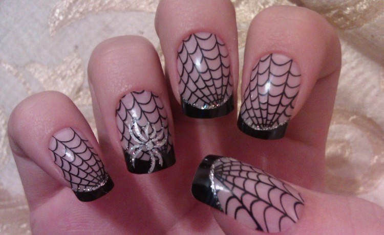 Ще один варіант нігтьового дизайну до осіннього свята Хеллоувін. Покрийте свої нігтики чорною павутиною і посадіть на один з них симпатичного сріблястого павучка. Сам манікюр будується на техніці чорного френча. Нігті покриваються блідо-бежевим або рожевим лаком. Павутину можете зобразити самостійно або скористатися наклейками.