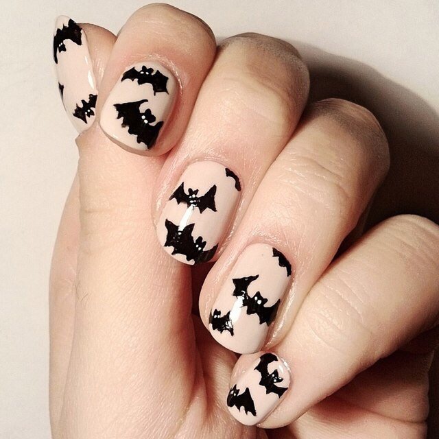 Хороший, тематичний манікюр. Він буде ідеальним доповненням вашого святкового образу. Короткі нігті дуже практичні і зручні. Пилкою робимо на них квадратну форму. Бежевий гель-лак наносимо на нігтьову пластину. Поверх нього малюємо чорним акрилом візерунок. Летюча миша – символ Хеллоувіну, робимо її на кожному нігтику.