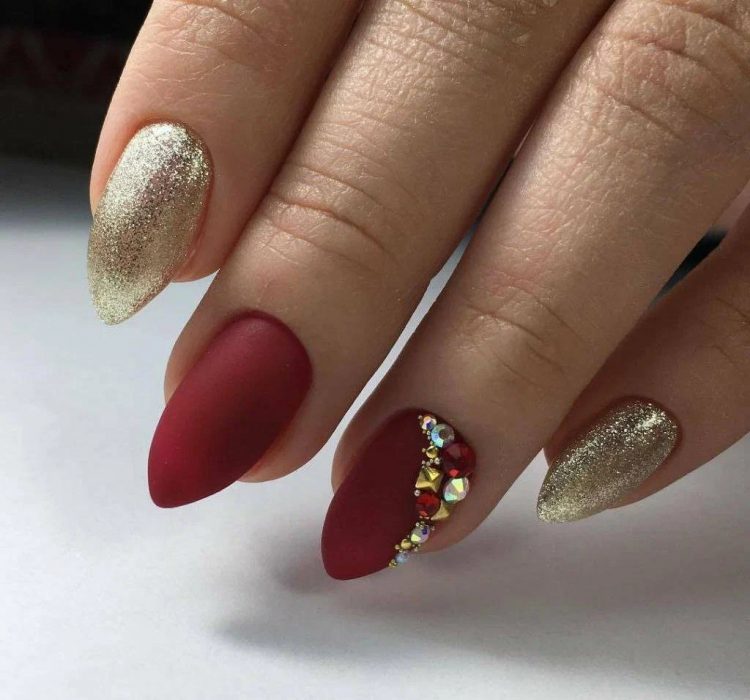 Червоний лак, комбінований із золотистими елементами та різними стразами