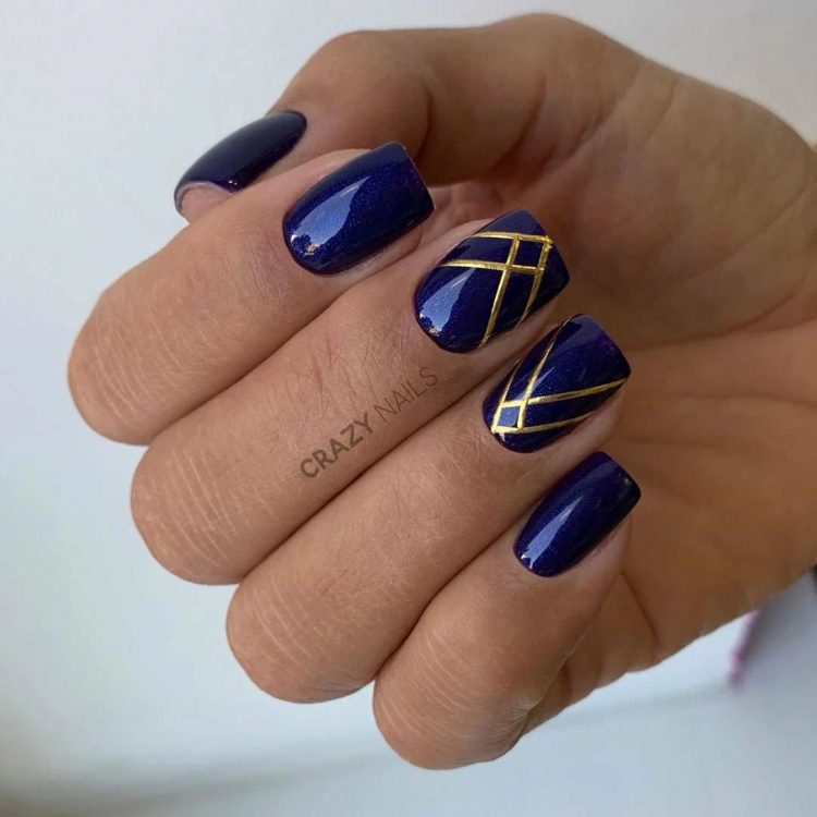 Стильний синій манікюр, доповнений тонкими блискучими смужками