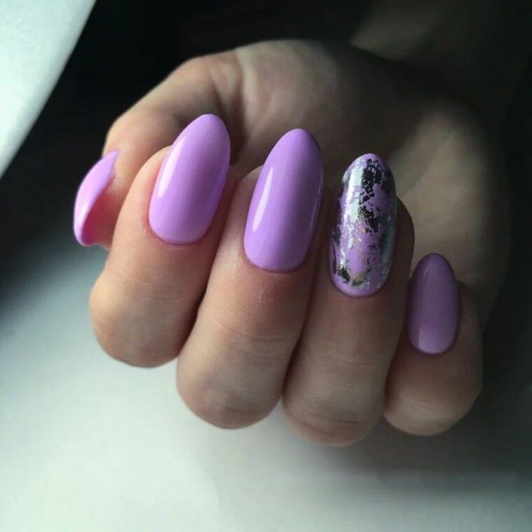 Насичений лавандовий відтінок лаку у поєднанні із золотистою та сріблястою фольгою на безіменному пальці та/або мізинці