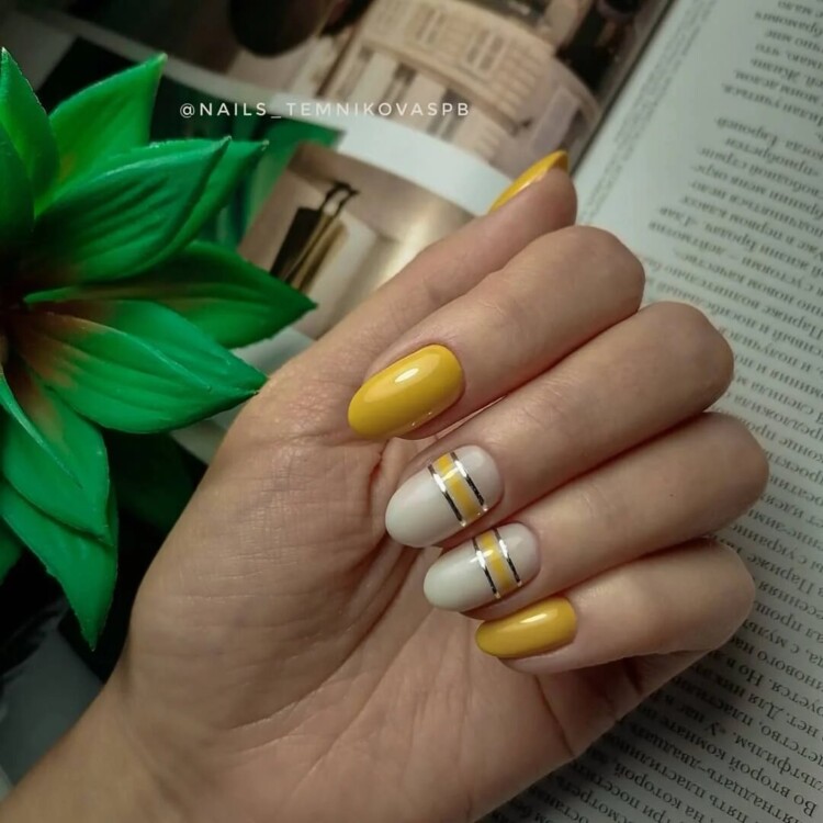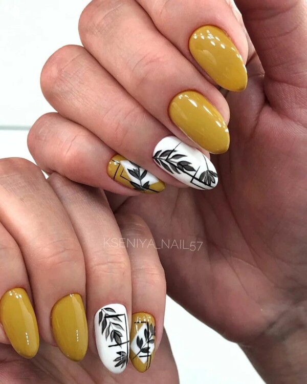 Чудова ідея оформлення нігтів – поєднання гірчичного лаку і білого. Родзинки манікюру можна додати за допомогою стемпінгу та лаконічної геометрії.