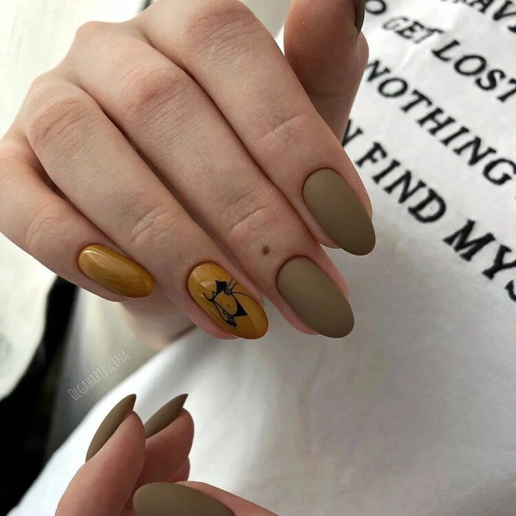 Якщо ви любите чорний колір, можете і його використовувати в парі з гірчичним. Скористайтеся матовим топом, щоб зробити манікюр більш шляхетним.
