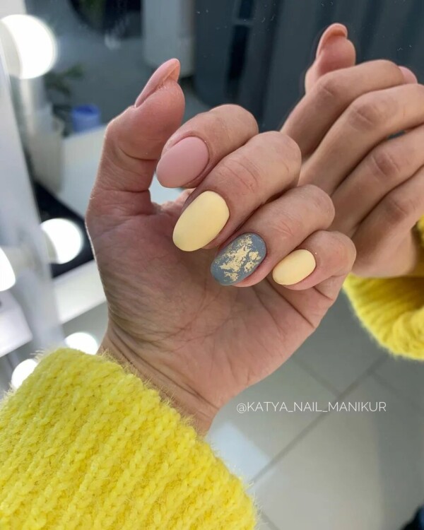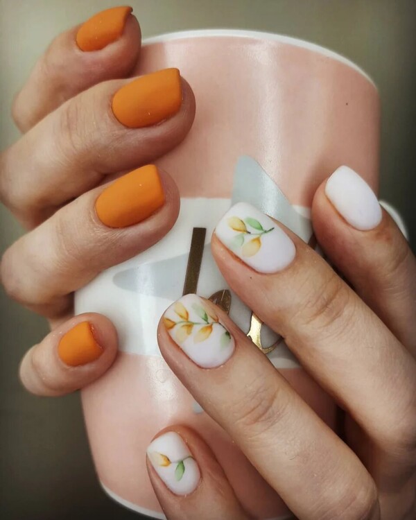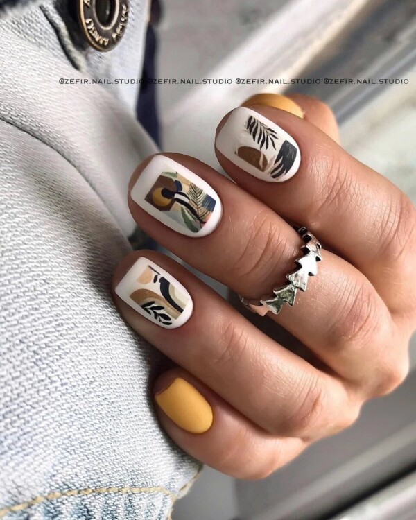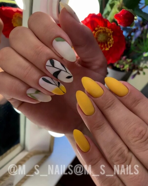 Хочете ніжний манікюр на коротких нігтях? Тоді покрийте їх всі гірчичним лаком, а білий використовуйте тільки на одному нігті, доповнивши ніжною жовтою квіткою. Така ідея нейл-арту прекрасно підійде для весни і літа.