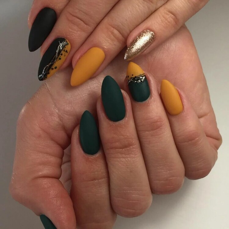 Вечірній нейл-арт можна отримати, якщо використовувати гірчичний, смарагдовий і чорний лаки, розбавивши їх під кінець блискучим глітером і павутинкою.