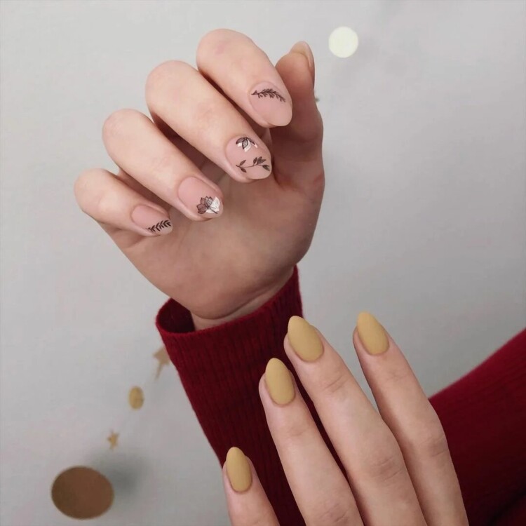 До речі, останнім часом всі прагнуть до натуральності, навіть в манікюрі. Саме тому бежевий лак став неймовірно популярний, а також техніка голого нігтика. Хочете створити лаконічний і стильний нейл-арт? Тоді нехай одна ручка буде оформлена в гірчичному кольорі, а інша в бежевому і доповнена чорним невеликим стемпінгом у вигляді рослинних візерунків.