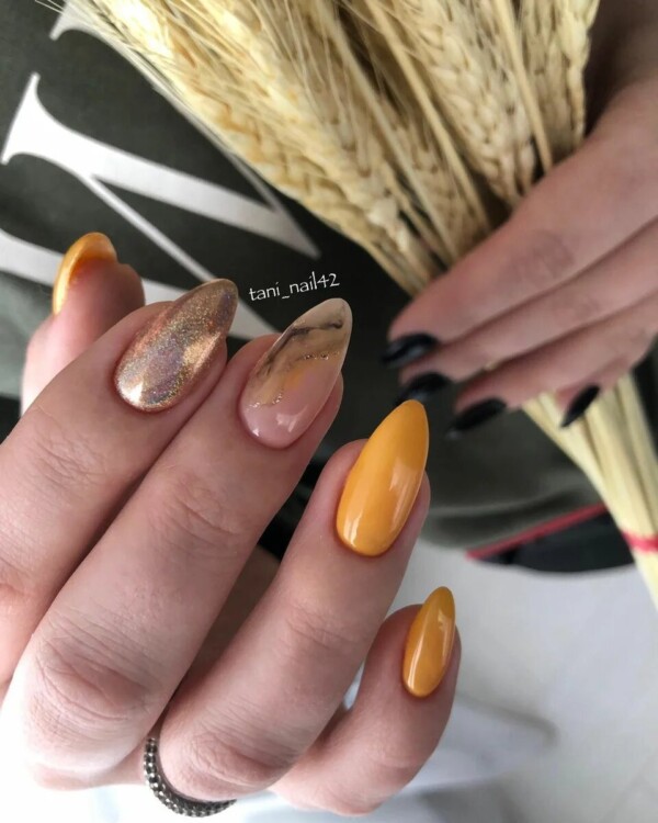 Любите мармуровий дизайн? Навіть його можна спробувати використовувати в парі з гірчичним лаком. Святковості манікюру додасть золотий глітер на одному нігті.