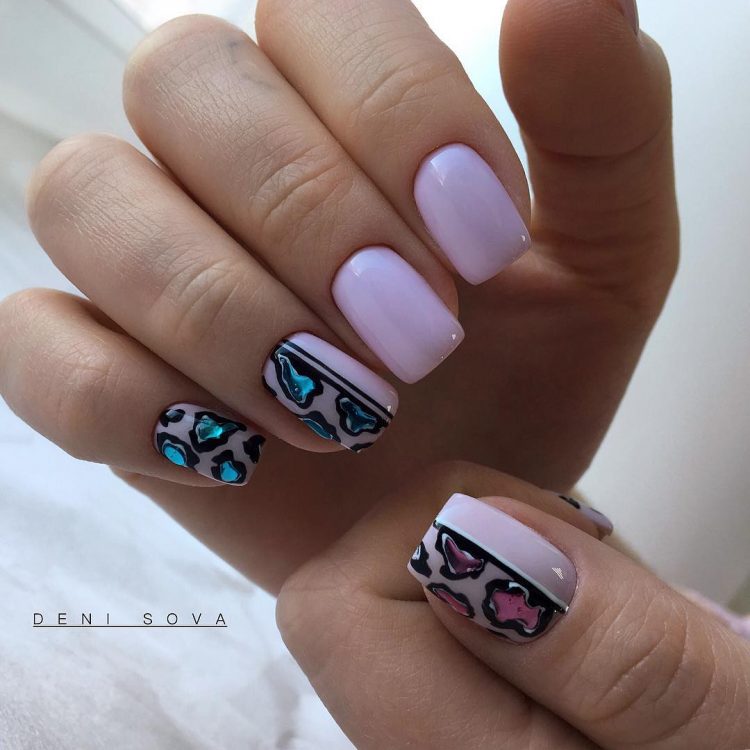 Ефектний манікюр на осінь для коротких нігтів – це дизайн із тваринним принтом. Але не можна вибирати занадто завантажений варіант, ідеально виглядає принт на одному або двох нігтях, при цьому решту варто покрити лаком із загальним спокійним тоном. У тренді будуть принти черепахи, зебри, корови, леопарда, тигра та змії.