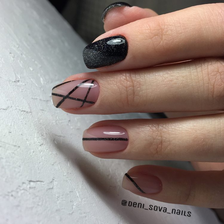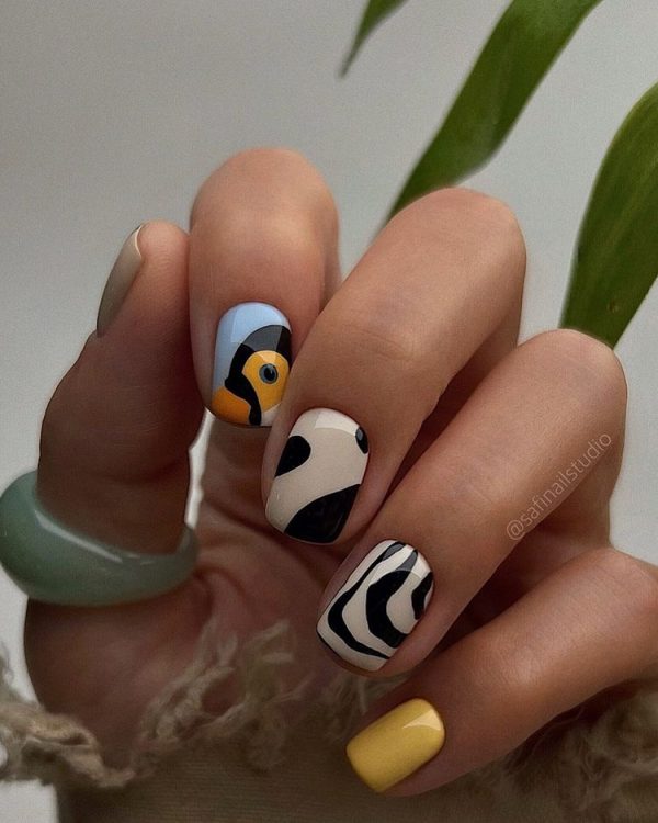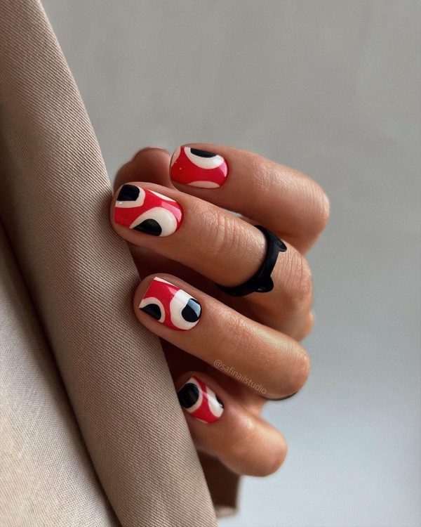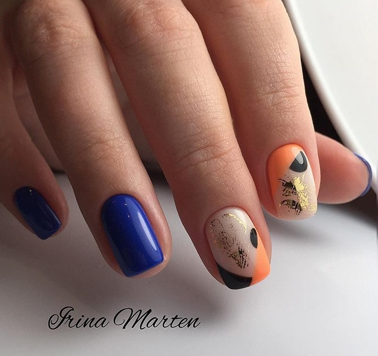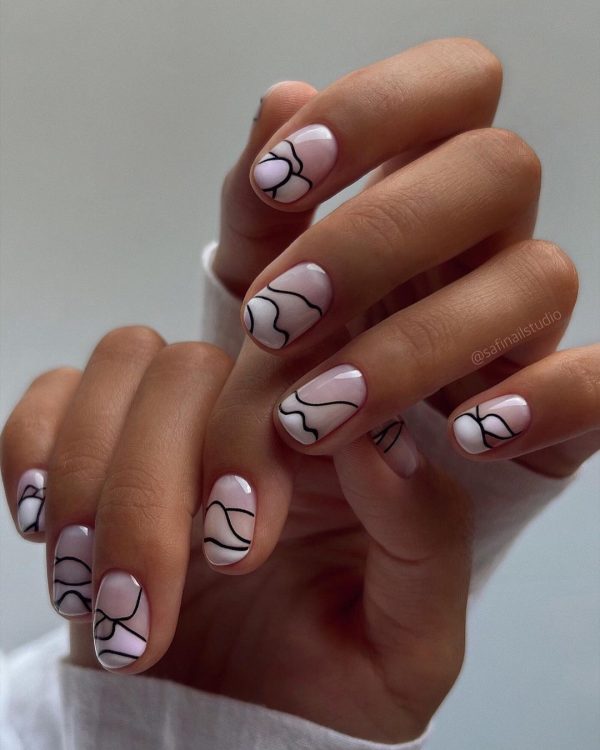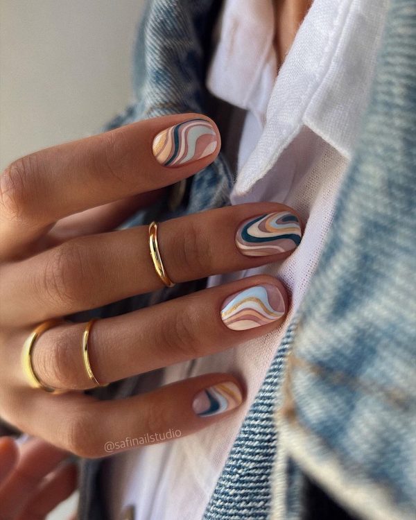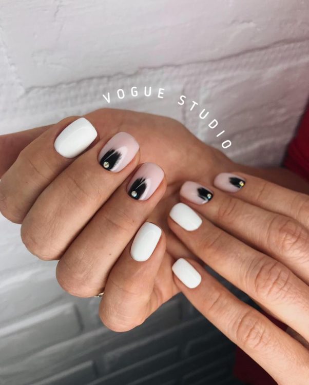 Дизайн з абстракцією підходить для будь-якого сезону. Для коротких нігтів на осінь краще вибирати приглушену та нюдову палітру, у тренді бежеві та карамельні, кавові та оливкові відтінки. Для абстрактних мазків підійдуть темніші кольори, у тому числі і чорний.
