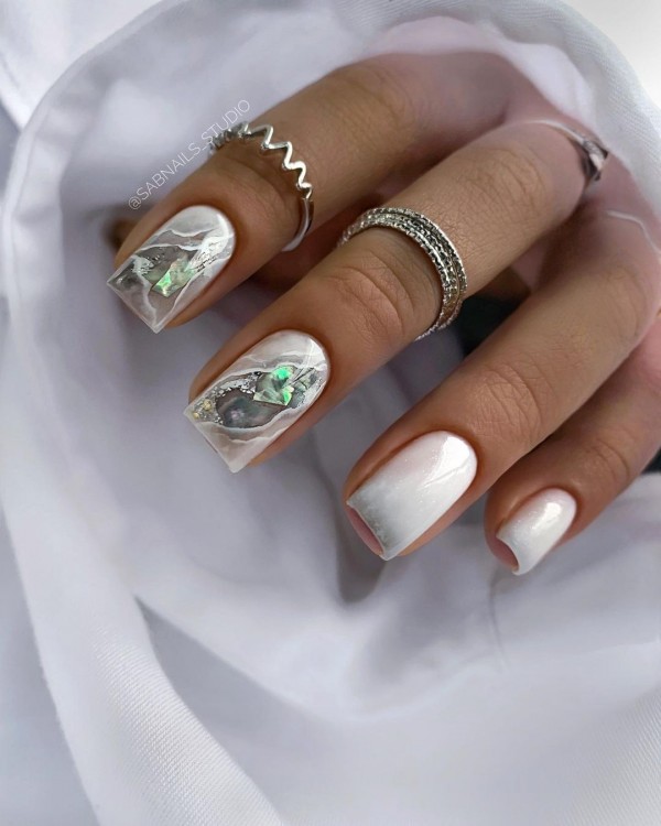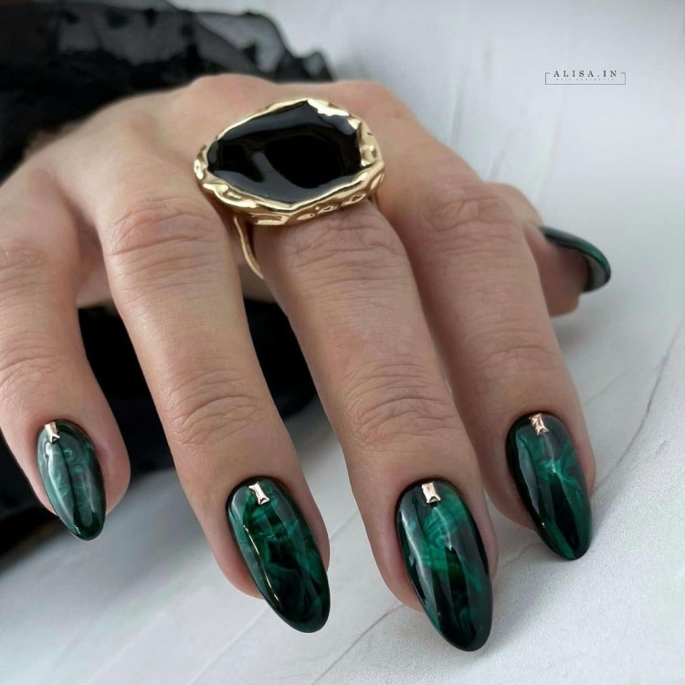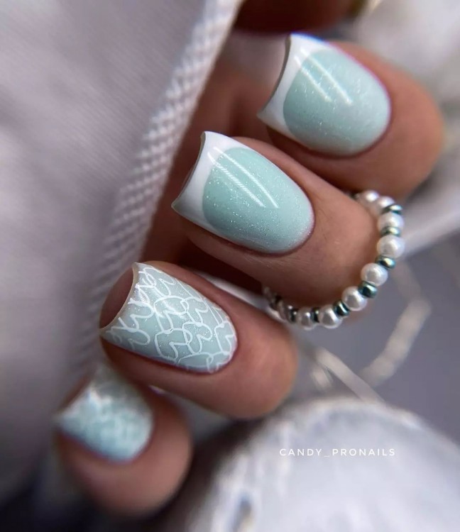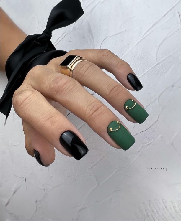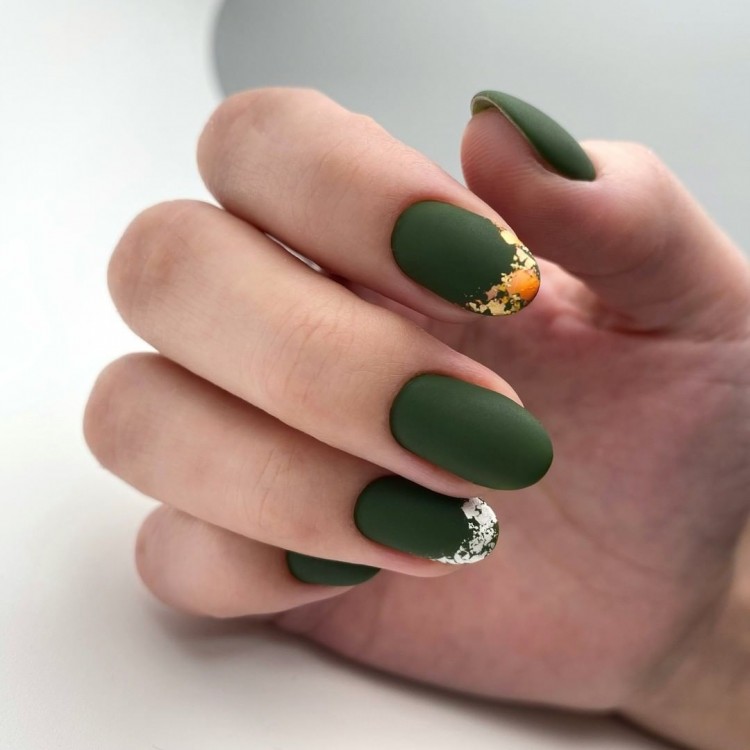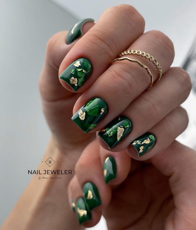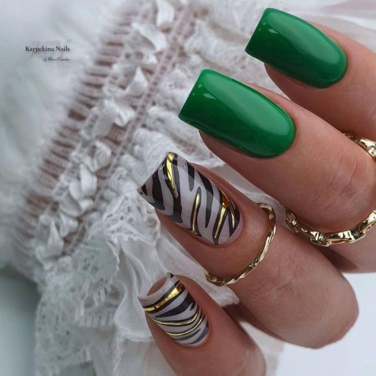Зелений та бірюзовий відтінок – тренди сезону. Для корпоративних урочистостей ці кольори підійдуть найкращим чином. Сріблясті хитромудрі візерунки на зеленому фоні виглядають найбільш виграшно. Сніжинки, новорічні кулі, пряникові чоловічки, тигренята на матовому покритті виглядають і стильно, і ефектно. Легкий декор стразами або гліттером прикрасить манікюр.