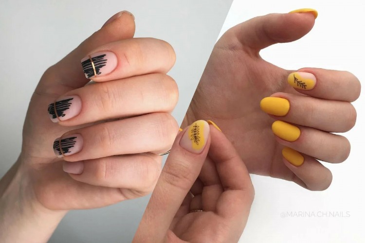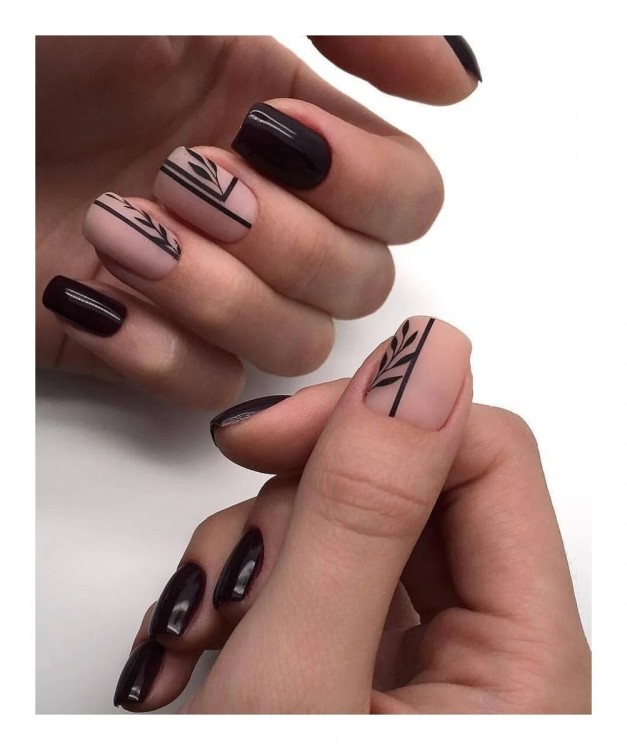 Дизайн з безліччю чорних “штрихів” ідеально підійде для повсякденного носіння і впишеться в будь-який образ. А якщо варіант, представлений вище вам не до душі, то можете попросити свого майстра намалювати мінімалістичні листочки. Вони також будуть у тренді у 2020 році.