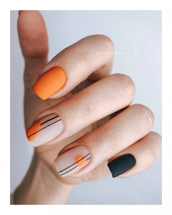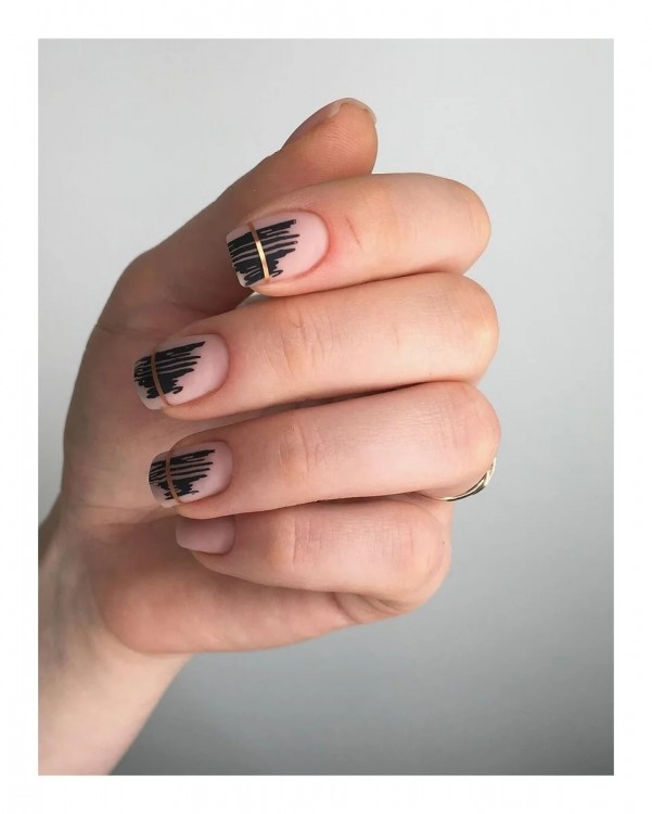 Для м’якості дизайну краще комбінувати чорний колір із нюдом. При цьому, це не обов’язково мають бути прості чорні смужки на нюдовому фоні. Можна спробувати незвичайніший варіант, наприклад, як на фото нижче.