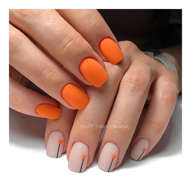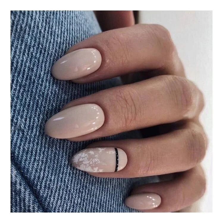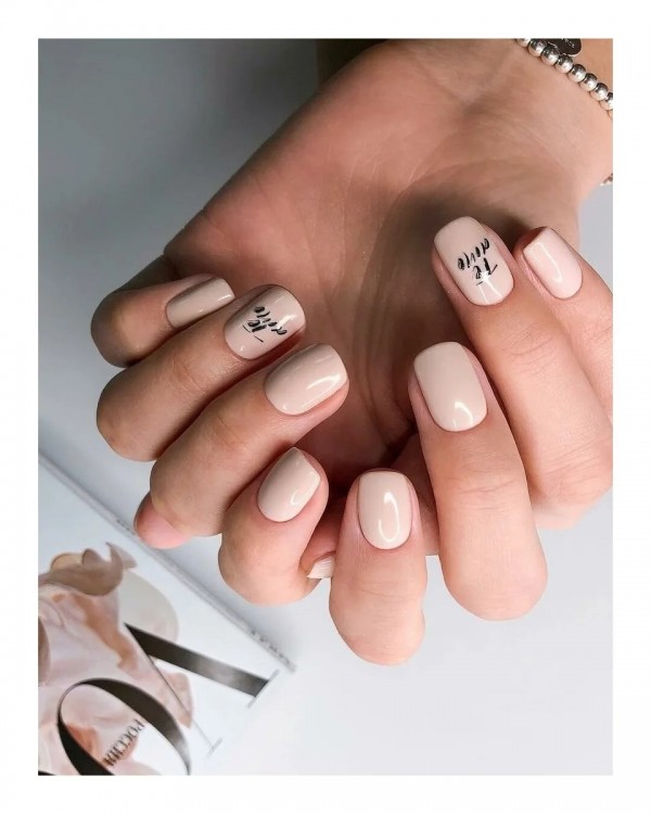 Якщо однотонний нюд для вас занадто простий і нудний, то можна додати трохи написів, блискіток або простої геометрії. Наприклад, як на фото нижче. Монохромний нюд на чотирьох нігтях і проста чорна смужка на безіменному пальці з білою матовою фольгою.
