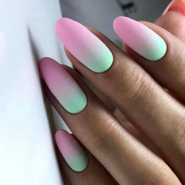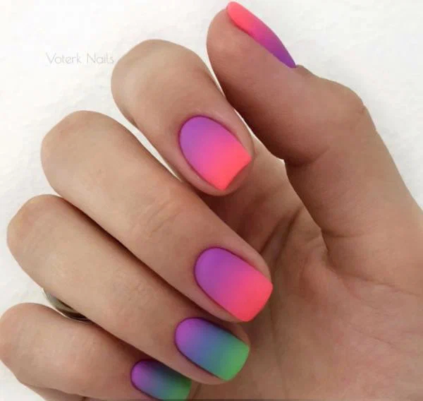 Матовий градієнт дозволить створити чудовий ефект. При цьому варто задіяти два-три відтінки. Світле покриття краще нанести на основу нігтика, потім додати темніший лак та зробити плавний перехід. До речі, райдужний градієнт виглядатиме шалено оригінально.