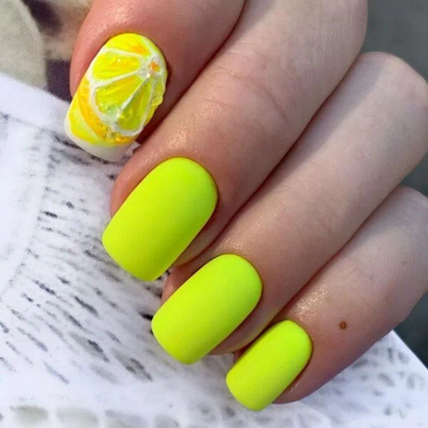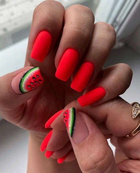 Матовий металік – ще один незвичайний тренд, який виглядає дуже цікаво. Нігті можна прикрасити золотистим, бронзовим або сріблястим гель-лаком. Наступна літня новинка – фруктовий дизайн, який виглядає соковито та яскраво. Для створення інтенсивного ефекту варто використовувати матову текстуру.