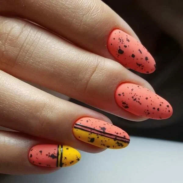 Крім того, манікюр на літо може бути виконаний у стилістиці «колор-блок», яка виглядає дуже витончено. Не менш філігранно він виглядає в поєднанні з павутинками, цятками і деталями іншого забарвлення, що розтікаються.