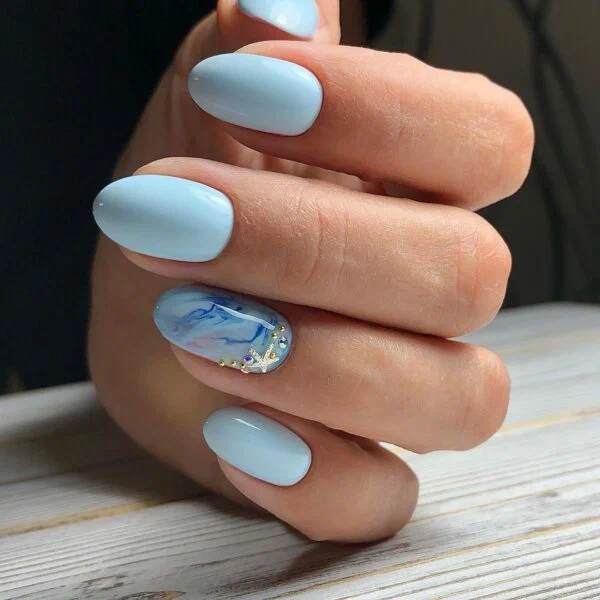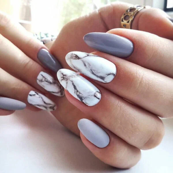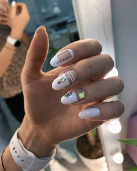 Пастельні відтінки можна поєднувати з абстрактними візерунками. При створенні геометричного дизайну варто намалювати квадрати, трикутники чи кола. Мармуровий манікюр має дуже стильний вигляд. До того ж його можна поєднувати з яскравим вбранням.