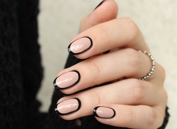 Оригінальний прийом передбачає контрастне обведення нігтя по всьому колу. Найефектніше виглядає чорне на бежевому або кольоровому тлі.