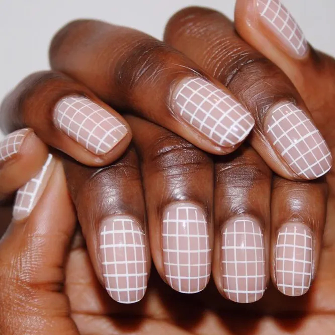 Розпис у клітинку не кидається у вічі і чудово підходить для офісного манікюру. Вважаємо його ідеальним варіантом для щоденного креативного нейл-арту. До речі, спробуйте зробити у такому стилі білий матовий манікюр!
