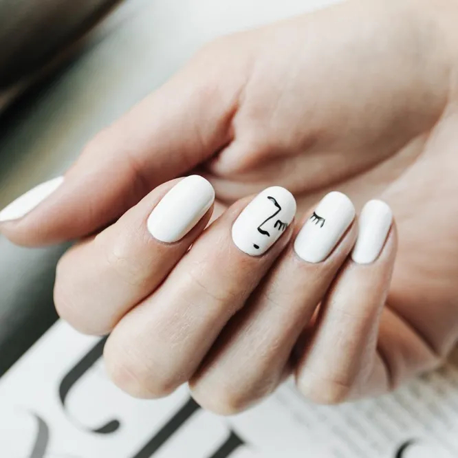 Такий білий манікюр із дизайном у стилі мінімалізм ми радимо всім любителькам мистецтва. Хочете його повторити? Тоді запасіться терпінням: насамперед підготуйте основу — кілька шарів білого лаку, а потім приступайте до малювання рис обличчя та вій. Для цього вам знадобиться тонка кисть та чорний лак.