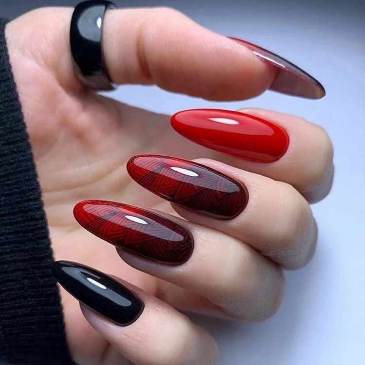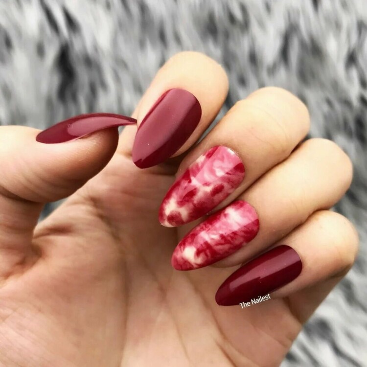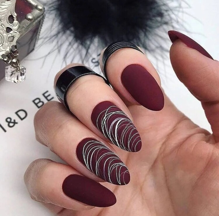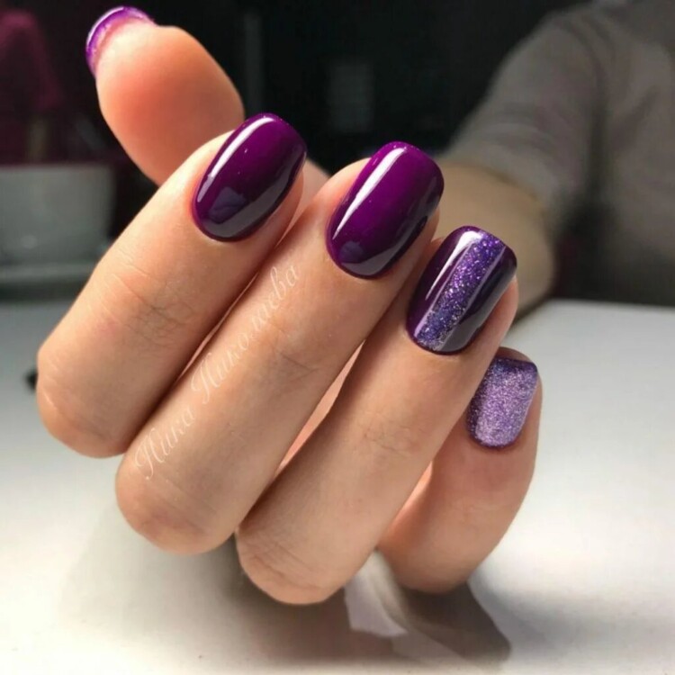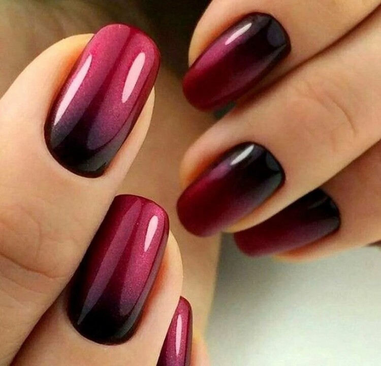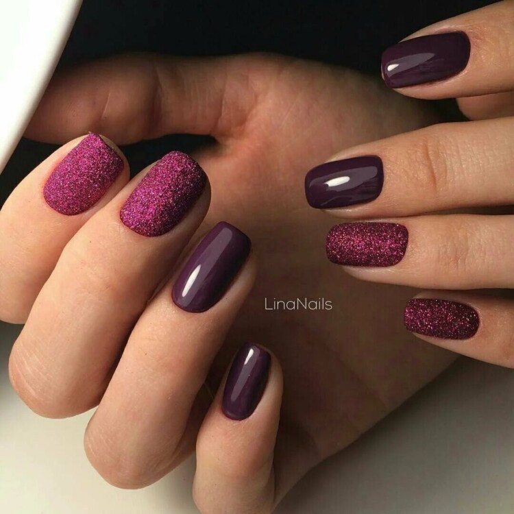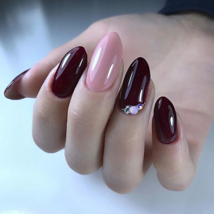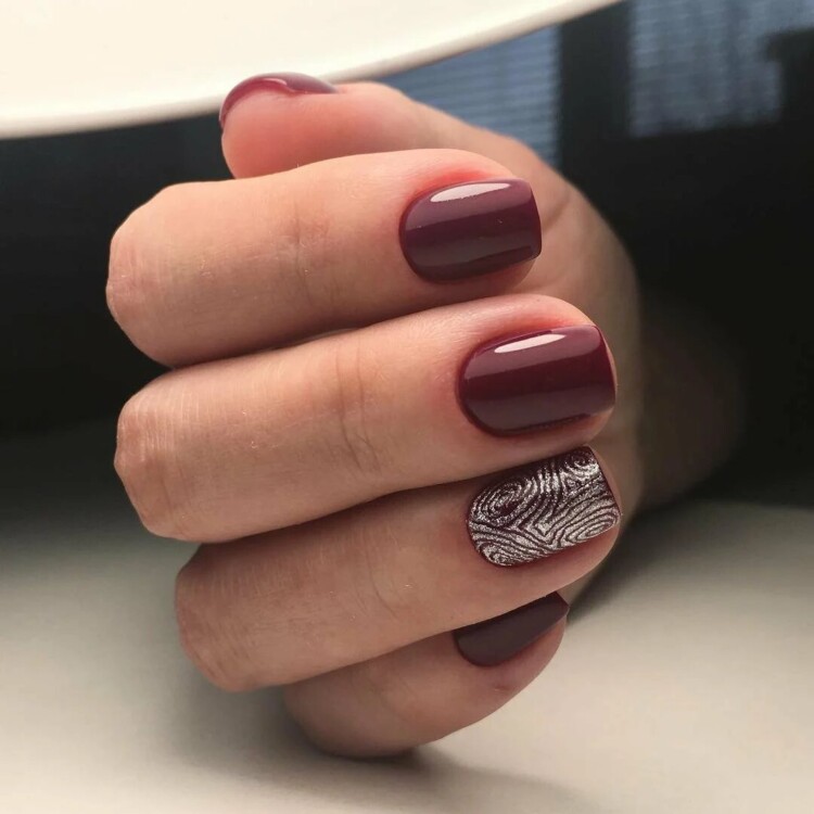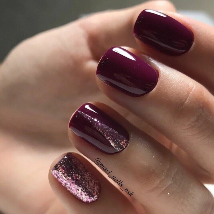 Червоний, ліловий, бордовий, фіолетовий, всі ці відтінки за умови вмілого поєднання з елементами декору виглядають дивовижно. Насичений відтінок привертає особливу увагу. Також для стриманого ефекту, манікюр можна розбавити нюдовими кольорами. Добре підійде втирка або фольга. Можна придивитися до мінімалізму або авангарду. Кожен елемент декору особливий, варто тільки визначитися.