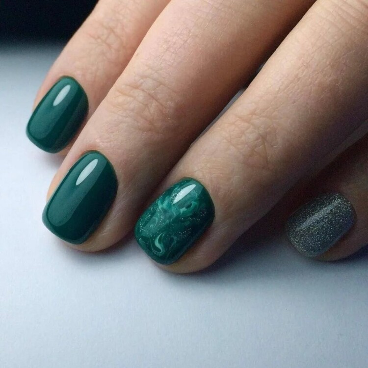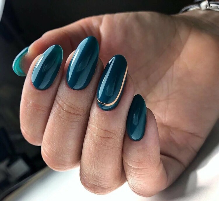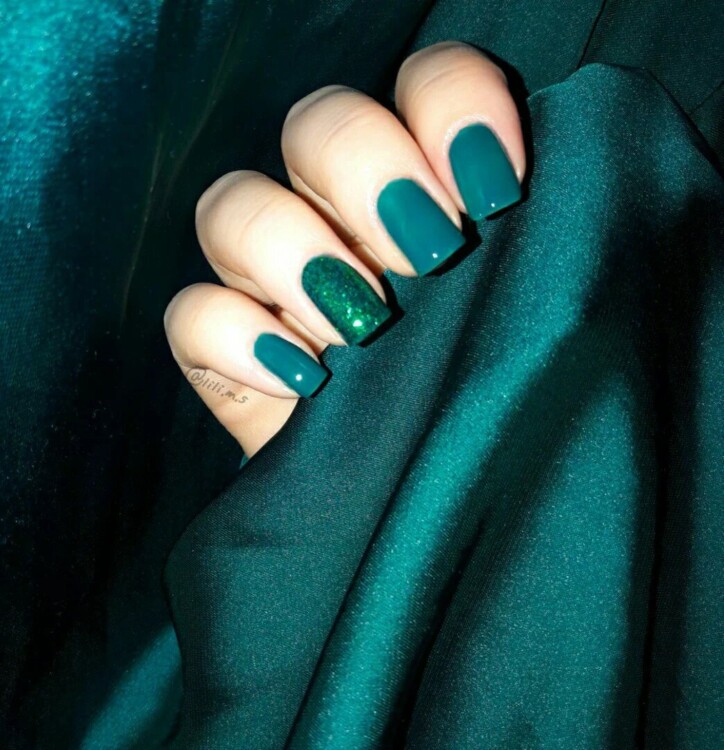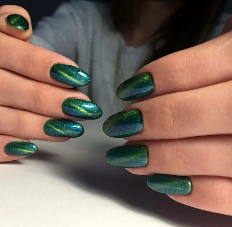 Смарагдовий відтінок також прекрасно поєднується з будь-яким образом. Насичений колір доповнює і надає самодостатності. З таким відтінком можна легко виконати техніку “котяче око”. Вона добре впишеться в будь-який наряд.