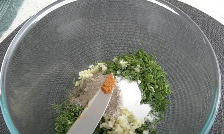 Нарізаємо петрушку і кладемо в глибоку миску, туди ж додаємо дрібно нарізаний часник, сіль і весь перець. А тепер ступкою розминаємо зелень так, щоб вона дала сік.