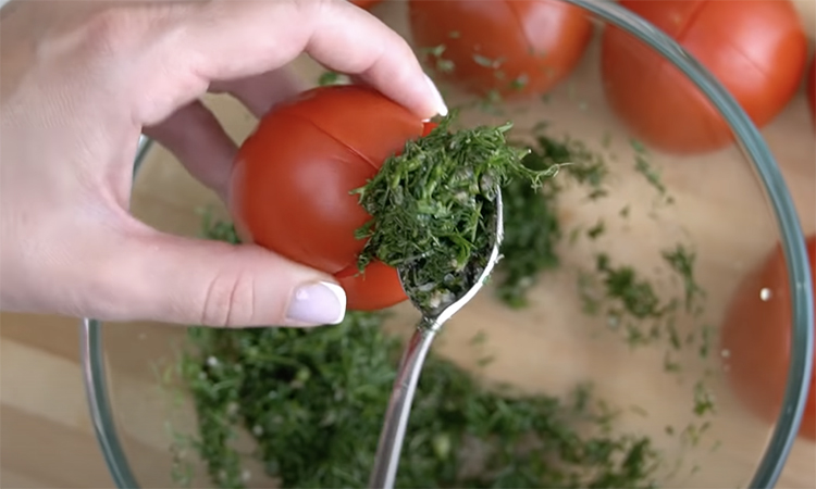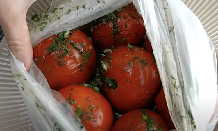 Стандартними способами помідори потрібно маринувати не менше місяця. Але можна легко скоротити процес і до 4 годин: з ранку кладемо томати з зеленню в пакет, щільно закручуємо, охолоджуємо і до обіду їх вже можна ставити на стіл.