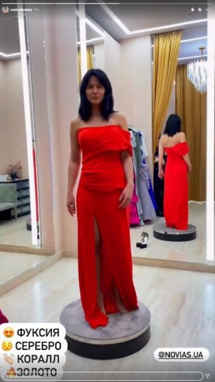 Спочатку Маша Єфросиніна приміряла рожеву сукню на бретелях та з красивим декольте. Потім телеведуча одягнула яскраво-червону сукню з оголеними плечима та розрізом.