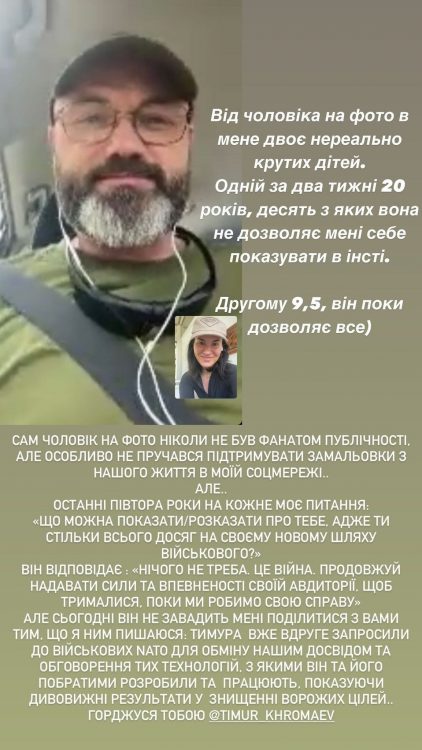 “Я ним пишаюся: Тимура вже вдруге запросили до військових НАТО для обміну нашим досвідом та обговорення тих технологій, з яким він та його побратими розробили та працюють, показуючи дивовижні результати у знищенні ворожих цілей”, – заявила зірка. Маша Єфросиніна додала, що її коханий уникає публічності. Проте, телеведуча не втрималась та похизувалась чоловіком.