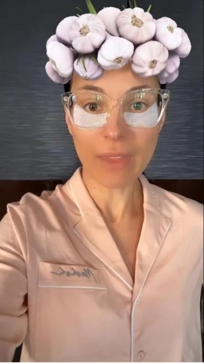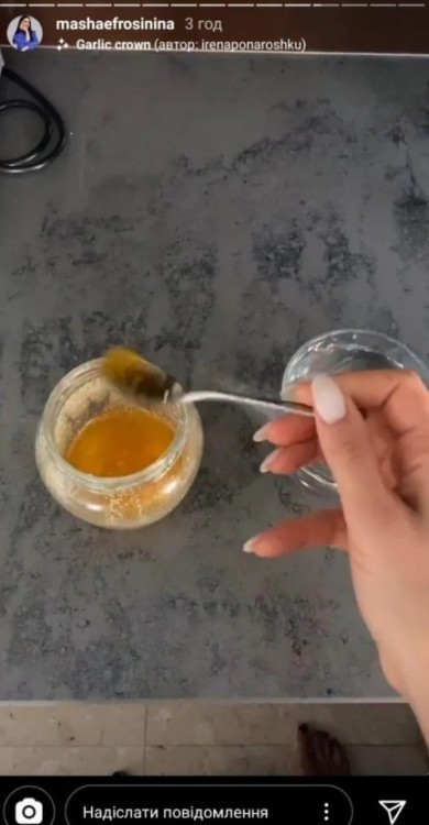 В інстаграм-сторіс Маші з’явилося декілька відео, на яких вона позує в кумедній інстаграмній масці з часником на голові. Телеведуча одягнена в піжаму власного бренду, а під очі нанесла зволожуючі патчі.