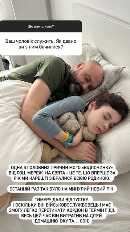 “Одна з головних причин мого “відпочинку” від соцмереж на свята – це те, що вперше за рік ми нарешті зібралися всією родиною. Востаннє так було на минулий новий рік. Тимуру дали відпустку. І оскільки він військовослужбовець і має змогу легко перетинати кордон в термін її дії, весь цей час він витратив на дітей, домашню їжу та сон”, – заявила Маша Єфросиніна.