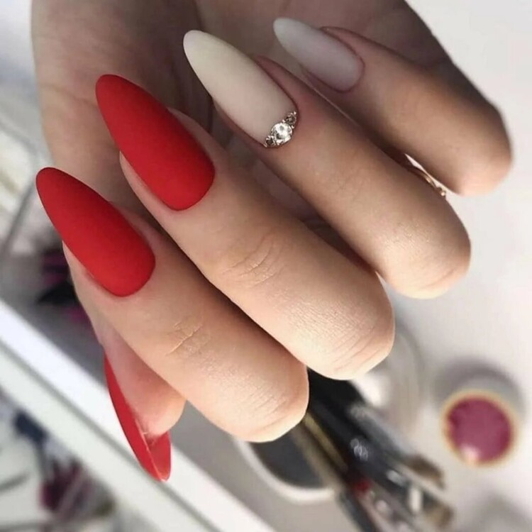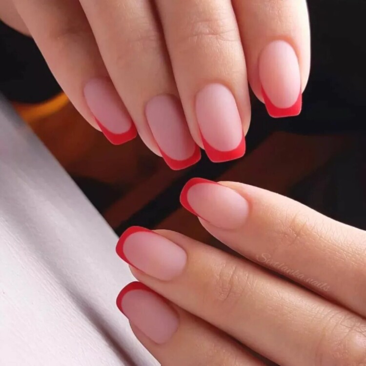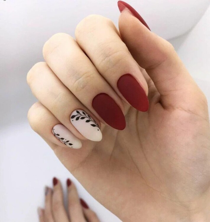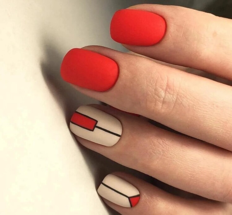 Червоний матовий манікюр в комбінації з нюдовим відтінком виглядає незрівнянно. Такий манікюр можна сміливо використовувати в офісі. Адже за допомогою спокійного нейтрального відтінку образ виходить більш стриманим. У вигляді декору можна додати геометрію. Мінімалізм також прекрасно виглядає на матовому покритті.