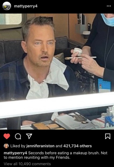 Меттью Перрі (він же Чендлер в серіалі) вирішив порадувати фанатів і поділитися в своєму Instagram першою фотографією з запису спеціального випуску: «За кілька секунд до того, як з’їсти кисть для макіяжу. Не кажучи вже про возз’єднання з «Друзями»».