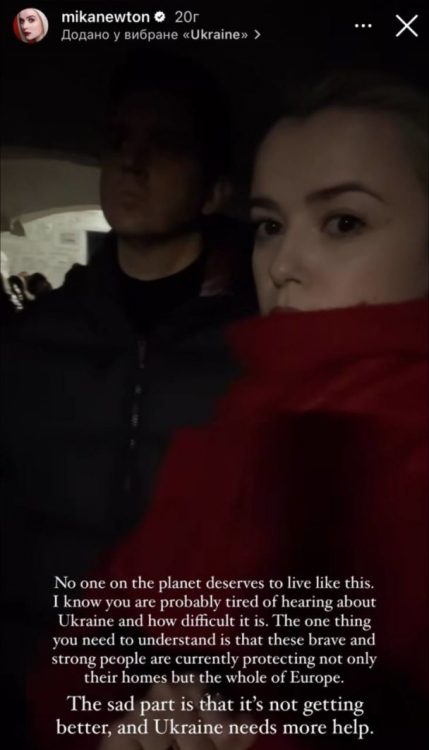 Нещодавно вона показала, як разом з коханим проводить час у Львові. Подружжя потрапило до Львівської національної опери на виставу “Наталка Полтавка”. Проте, через деякий час розпочалась повітряна тривога. Міка Ньютон заявила, що їй боляче спостерігати за тим, як кожного дня її рідну країну поступово знищують.